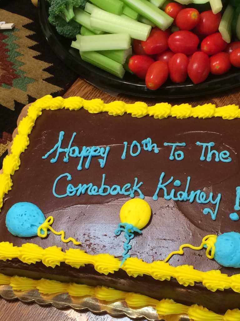 Now, here we are at Number 15! The Comeback Kidney, thankfully, is still going strong, and my humble remaining kidney is doing great, so we have much to celebrate. Though there was no big party, we were able to enjoy a lovely dinner at a favorite restaurant followed by an updated version of the cake.